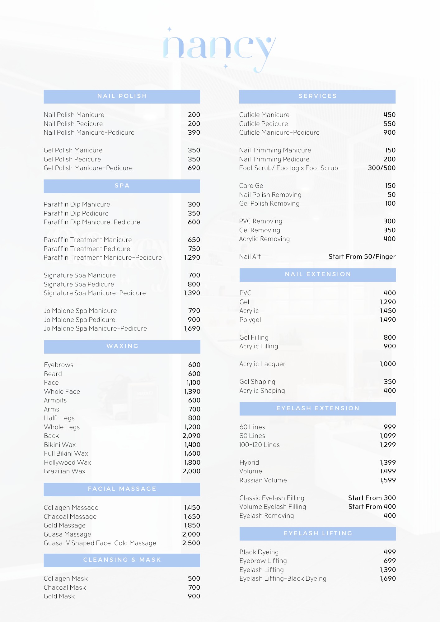 At nancy, we provide a variety of services, such as manicure-pedicure, gel polish, nail extension, eyelash extension, eyelash lifting, spa, waxing, facial massage, etc. With more than 20 years of experience, nancy guarantees the best services.